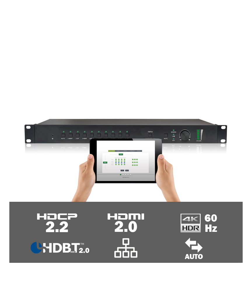 De SCU91T is een professionele 9x1 multi-formate scaler/switcher met 4K (60Hz, 4:2:0) output over HDbaseT en HDMI 2.0. De SCU91T is voorzien van alle nieuwe technologieen en is klaar voor de toekomst. De SCU91T is voorzien van HDMI, HDBaseT, VGA en DisplayPort ingangen.